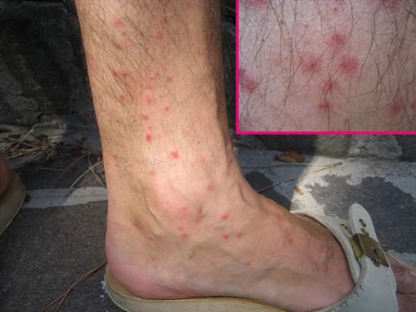 | Multiple, poco numerose, sparse | Viso, braccia, torace, parti scoperte | Fastidiosa, prurito | Notturno o al risveglio, a volte anche diurno | Camera da letto oppure giardino, orto | Zanzara (***) |